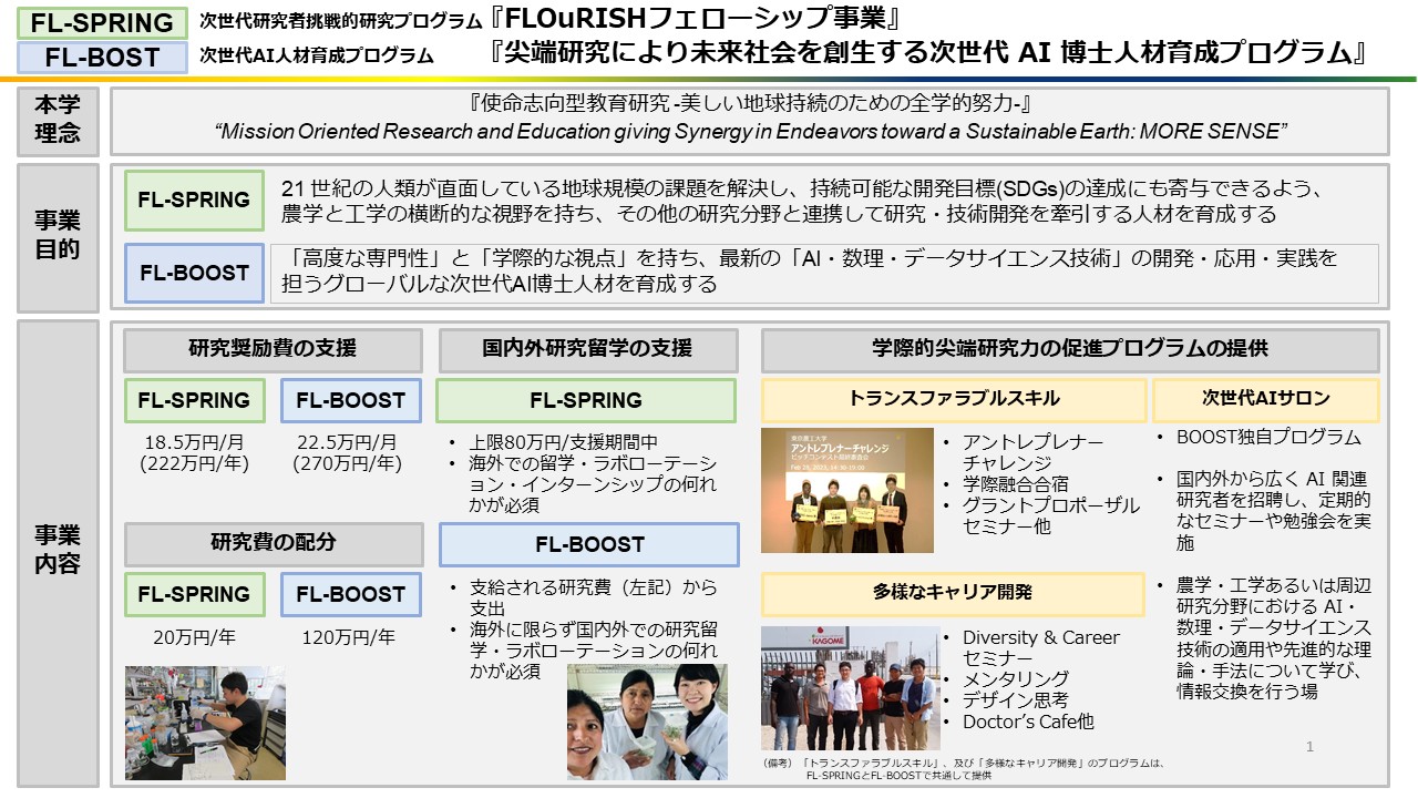 東京農工大学では、国立研究開発法人科学技術振興機構(以下、JST)による公募・採択事業として、令和3年度より、博士後期課程学生を対象とした「FLOuRISH次世代研究者挑戦的研究プログラム・フェローシップ制度(FL-SPRING)」を実施してきました。令和6年度からは新たにJST『次世代研究者挑戦的研究プログラム(SPRING)』及びJST『次世代AI人材育成プログラム(BOOST)』に採択され、本学は「FLOuRISHフェローシップ事業(以下、FL-SPRING)」及び「尖端研究により未来社会を創生する次世代 AI 博士人材育成プログラム(以下、FL-BOOST)」として実施しています。