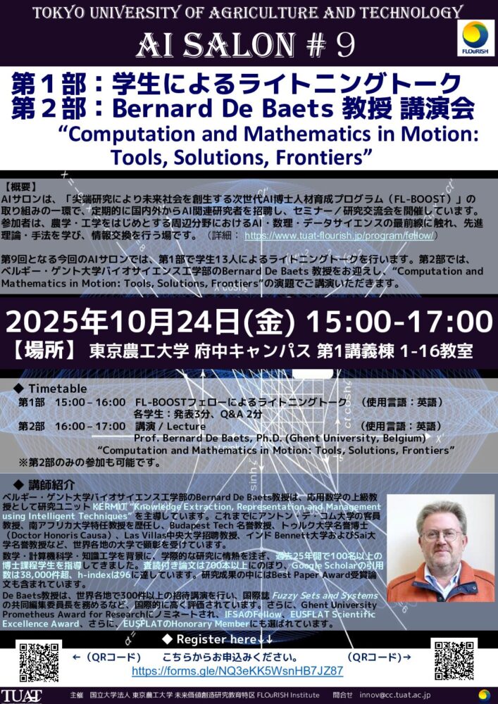 第9回となる今回のAIサロンでは、第1部で学生13人によるライトニングトークを行います。第2部では、ベルギー・ゲント大学バイオサイエンス工学部のBernard De Baets 教授をお迎えし、“Computation and Mathematics in Motion: Tools, Solutions, Frontiers”の演題でご講演いただきます。