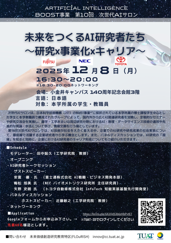 次世代AIサロンは、日本科学技術機構(JST)のBOOST事業*1に採択されている本学所属の博士課程学生中心とした学生と本学教職員で構成されたグループによって、国内外から広くAI関連研究者を招聘し、定期的なセミナーや研究交流会を実施し、農学・工学あるいは周辺研究分野におけるAI・数理・データサイエンス技術の適用や先進的な理論・手法について学び、情報交換を行う場としています。